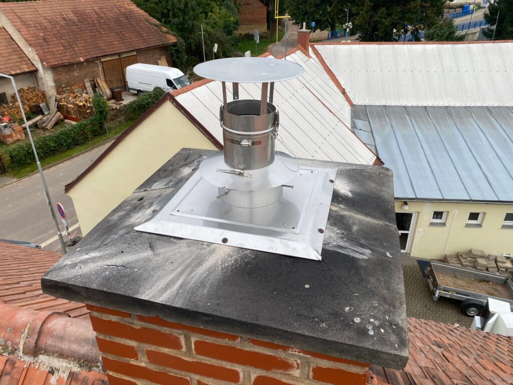 Přestavba komínových hlav, oplechování komínu do krytiny, vyvložkování komínivého průduchu a omazání hřebene v Lipce